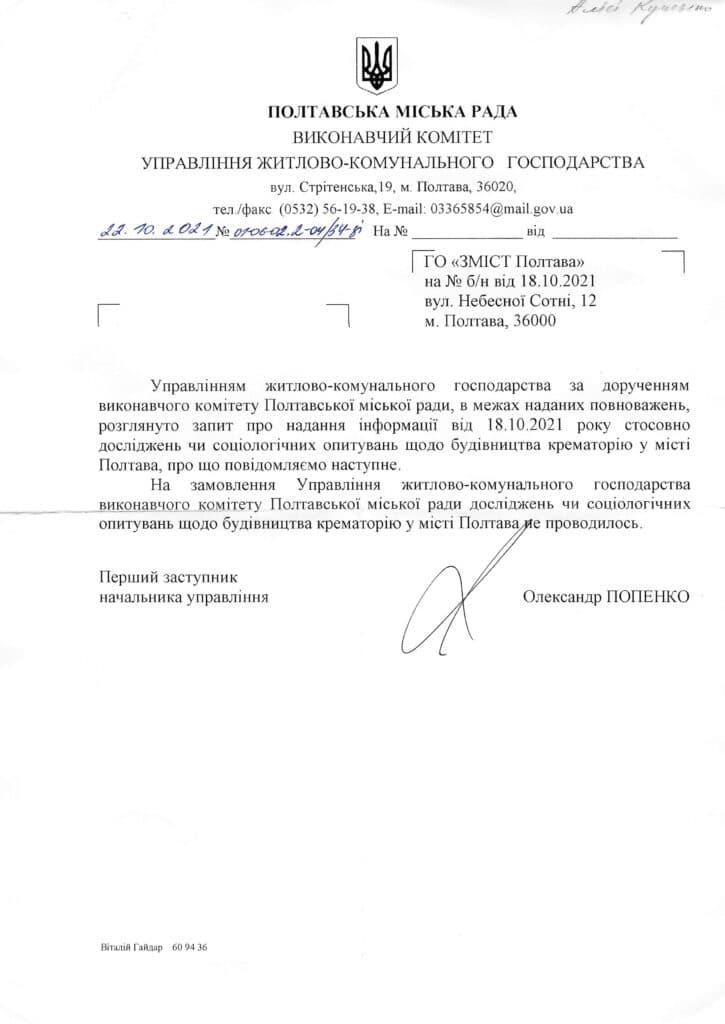 У Полтаві не досліджували рентабельність будівництва крематорію – офіційна відповідь УЖКГ