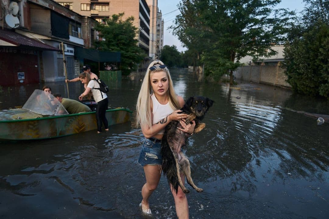 Херсон, дівчина рятує собаку від наслідків підриву Каховської ГЕС.