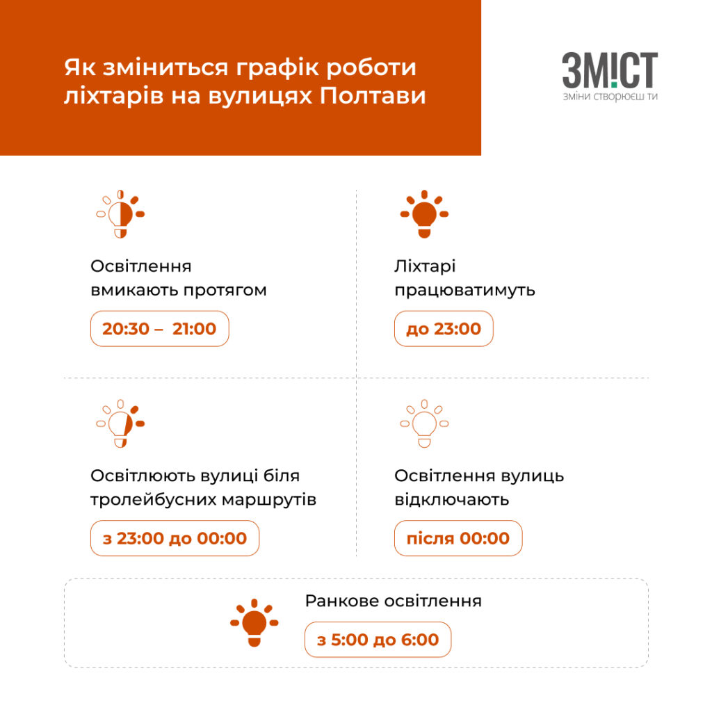 З 18 жовтня з 05:00 до 06:00 ранку також вмикають вуличне освітлення, щоб полтавцям було легше повертатися з нічних змін.
