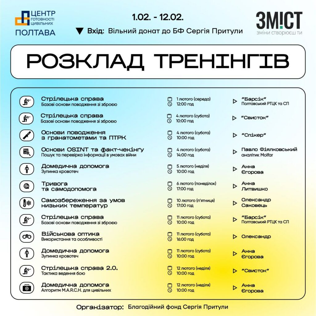 Нагадаємо, що з 26 по 31 січня у Полтаві провели 8 тренінгів на військову тематику. Серед нових тем – «Інженерна справа» та «Психологічна самодопомога та розвиток стресостійкості в умовах воєнного часу».