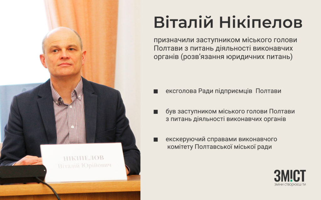 Віталій Нікіпелов був заступником Олександра Мамая минулої каденції. Його звільнили на сесії Полтавської міськради у 2019 році, а він намагався оскаржити це рішення у суді. Його призначили заступником з питань діяльності виконавчих органів (розв’язання юридичних питань).