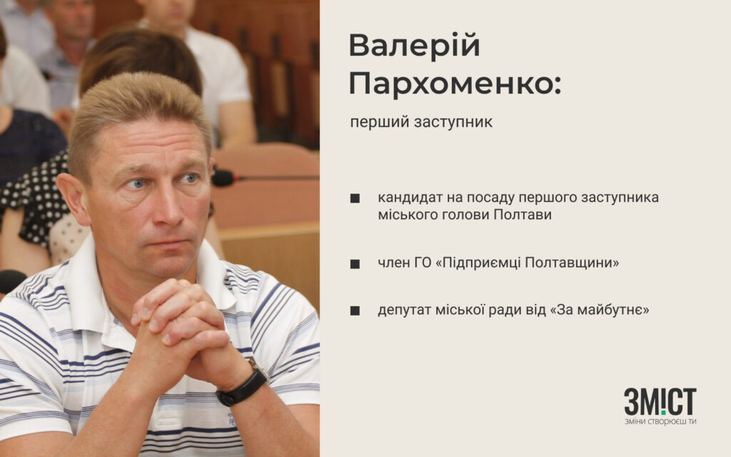 Також Валерій Пархоменко є членом ГО «Підприємці Полтавщини» у діяльності якої бере участь секретарка міської ради часів каденції Мамая та очільниця фракції «ОПЗЖ» у міськраді Оксана Деркач. Очолює цю громадську організацію Євген Дикань, депутат міськради від «За майбутнє».