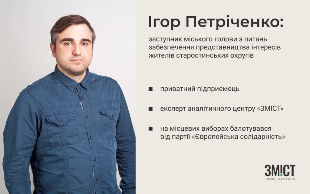 Ігор Петріченко підприємець та експерт аналітичного центру «ЗМІСТ». На місцевих виборах балотувався від «Європейської солідарності», але депутатом так і не став.