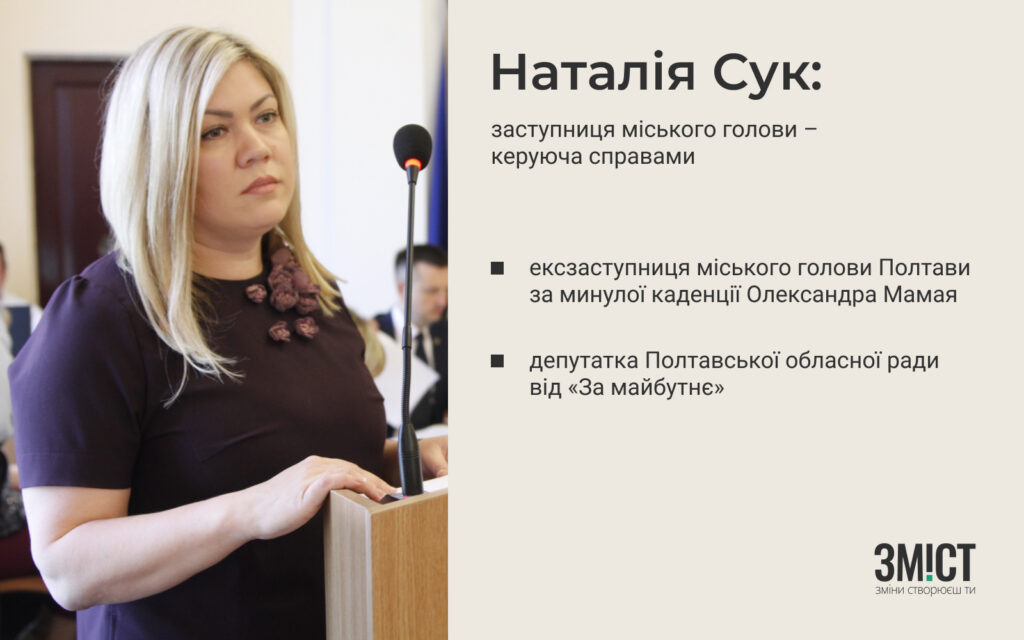 Також на посади призначили Наталію Сук, Світлану Тарашевську та Ольгу Борисенко. За минулої каденції Олександра Мамая вони уже були заступницями міського голови Полтави. Потім їх звільнили під приводом реорганізації виконкому міськради.