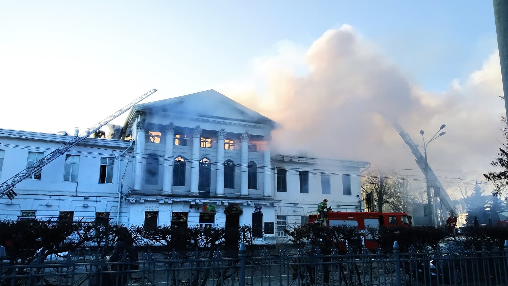 Поки ДСНС ліквідовує пожежу в колишній будівлі Полтавського дворянського зібрання патрульна поліція перекрила рух транспорту.
