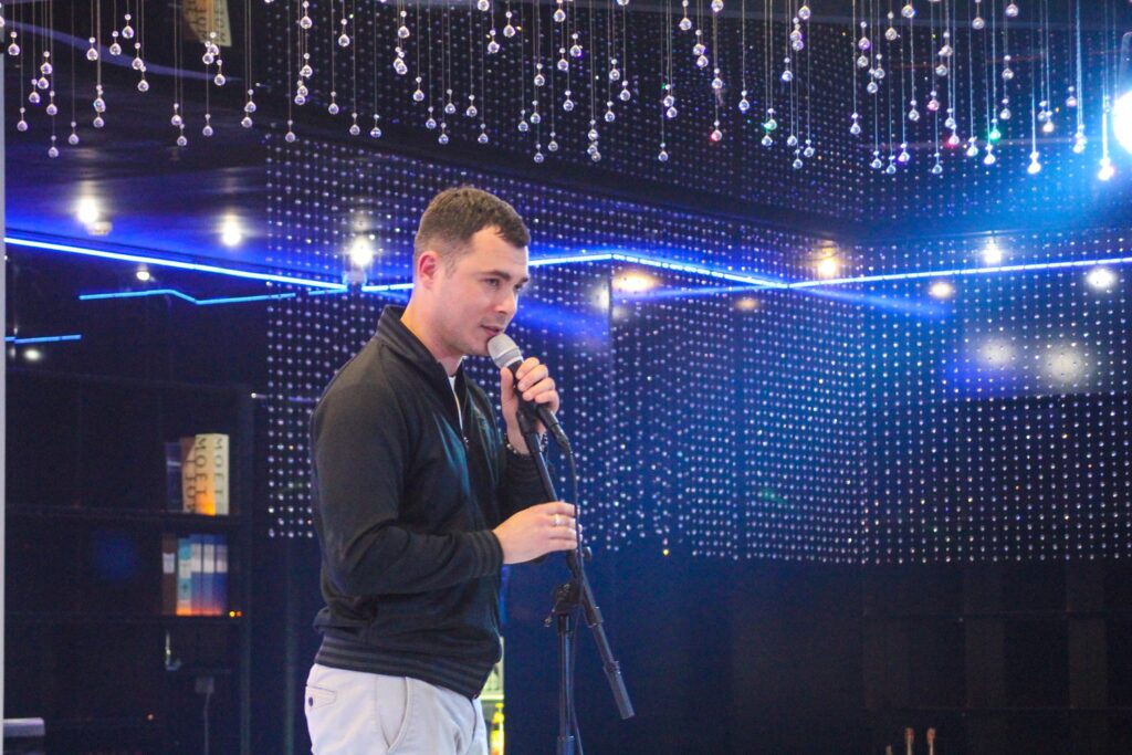 Під час виступу Антон Мигаль розповів про подорожі літаками, супермаркети та касирів, лікарні, соцмережі, веганів, розлучення тощо.