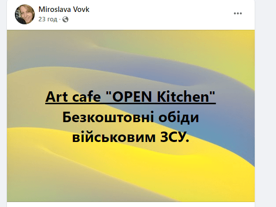Кафе OPEN KITCHEN надає безкоштовні обіди, а KavaPoltava готує безкоштовну каву для українських військовослужбовців.