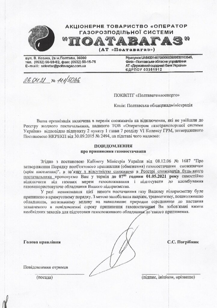 26 квітня комунальне підприємство «Полтаватеплоенерго» отримало попередження від газотранспортної компанії про припинення із ранку 1 травня цього року газопостачання до об’єктів підприємства.