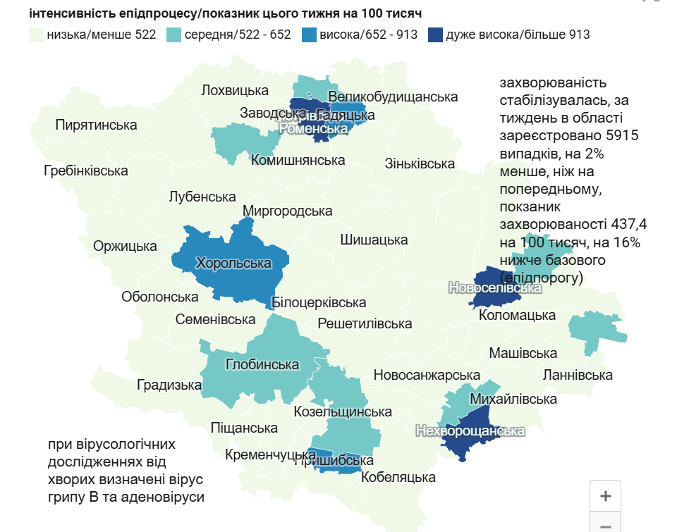 - Попри стабілізацію, у кількох громадах спостерігають високий рівень захворюваності: Петрівсько-Роменській, Новоселівській, Нехворощанській – дуже високий рівень;