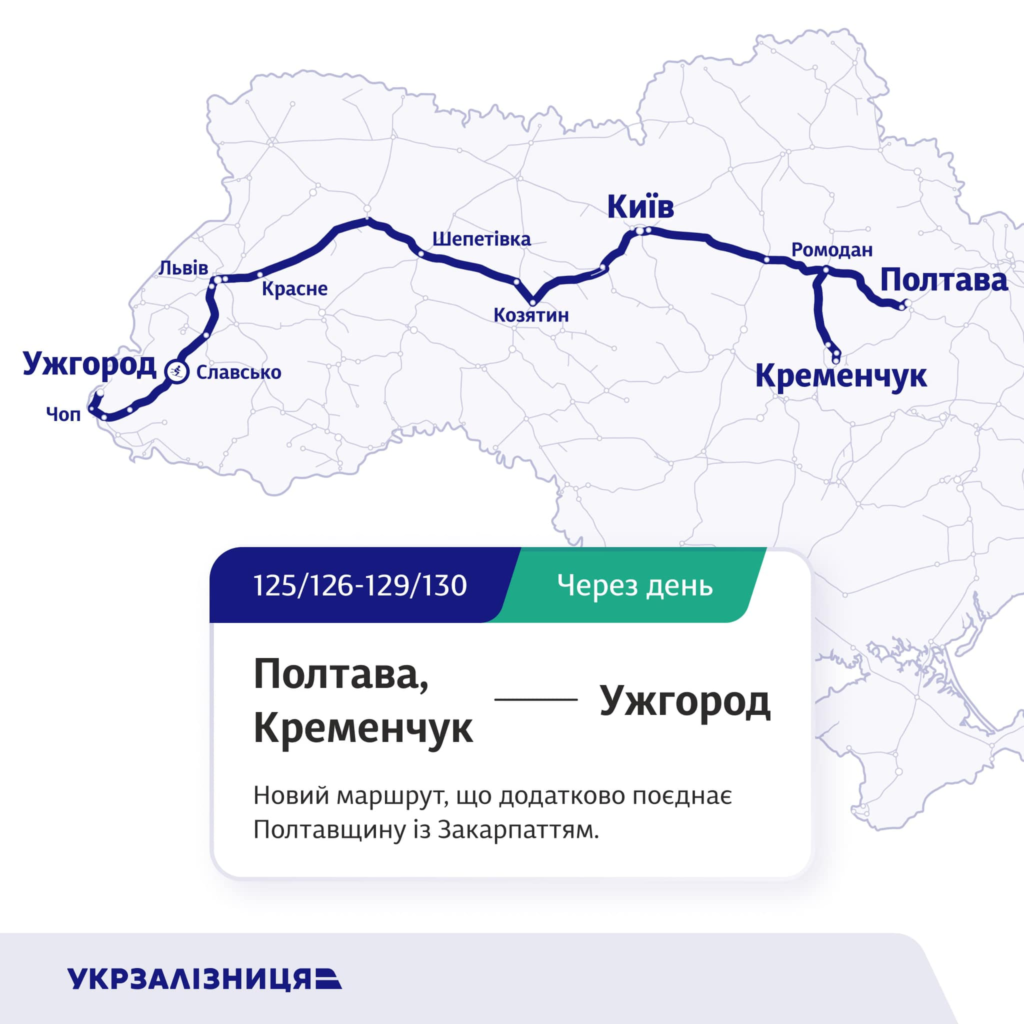 - поїзд № 125/126-129/130 Полтава, Кременчук - Ужгород (через день) – новий маршрут, що додатково поєднає Полтавщину зі Славськом та Закарпаттям;