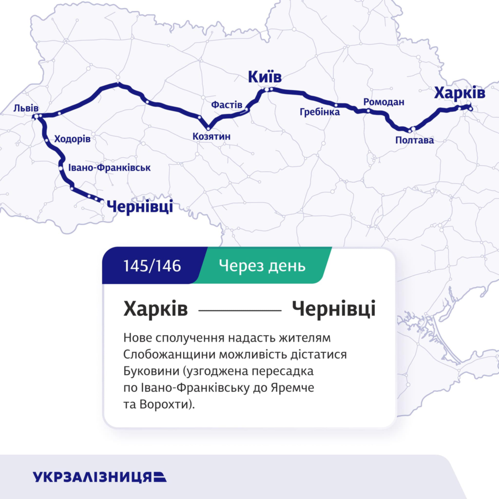 - поїзд № 145/146 Харків - Чернівці (через день) – нове сполучення надасть жителям Слобожанщини можливість дістатися Буковини.