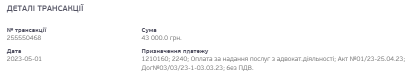 Делія отримав гроші за надання послуг з адвокатської дiяльностi. Акт виконаних робіт підписали 25 квітня.