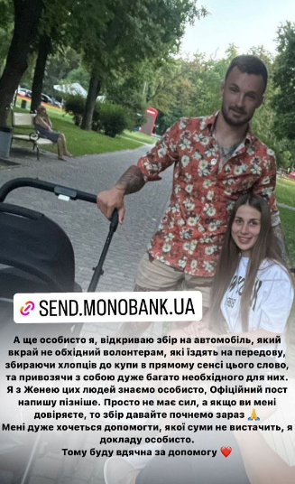 «Особисто я відкриваю збір. … Я з Женею знаємо цих волонтерів особисто, офіційний пост напишу пізніше. Якщо ви мені довіряєте, то збір почнімо зараз. Мені дуже хочеться допомогти, якщо зібраної суми не вистачить, я докладу залишок».