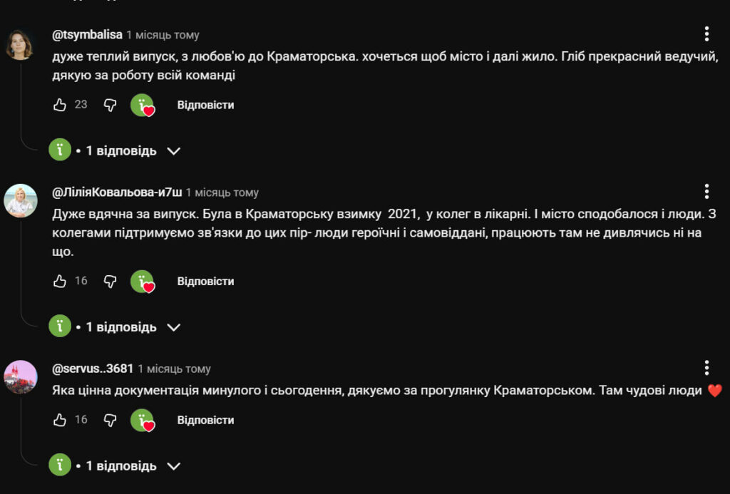 «Ключовим фокусом проєкту “Про фронтові міста” є розвінчування міфів, дуже часто негативних та звісно фіксування життя міста. От, наприклад, ми закарбували теплий і приємний Краматорськ початку вересня. І от він в більшості людей закарбується таким. У нашої команди – точно», – поділився ветеран.