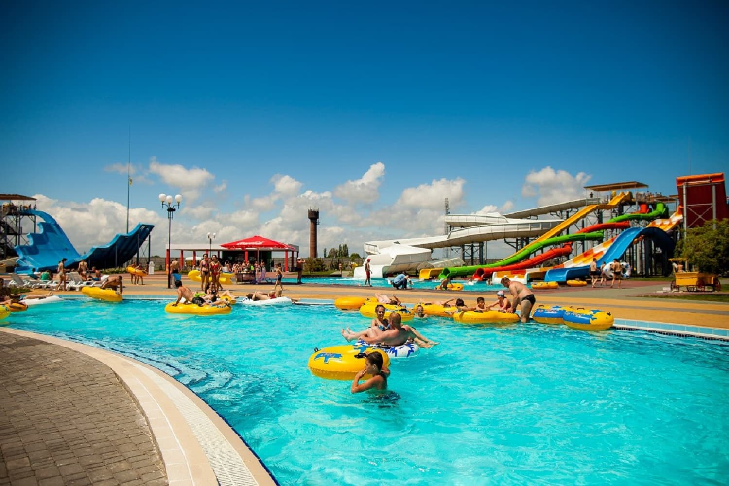 На території аквапарку розташовано 3 басейни та 4 водних гірки: