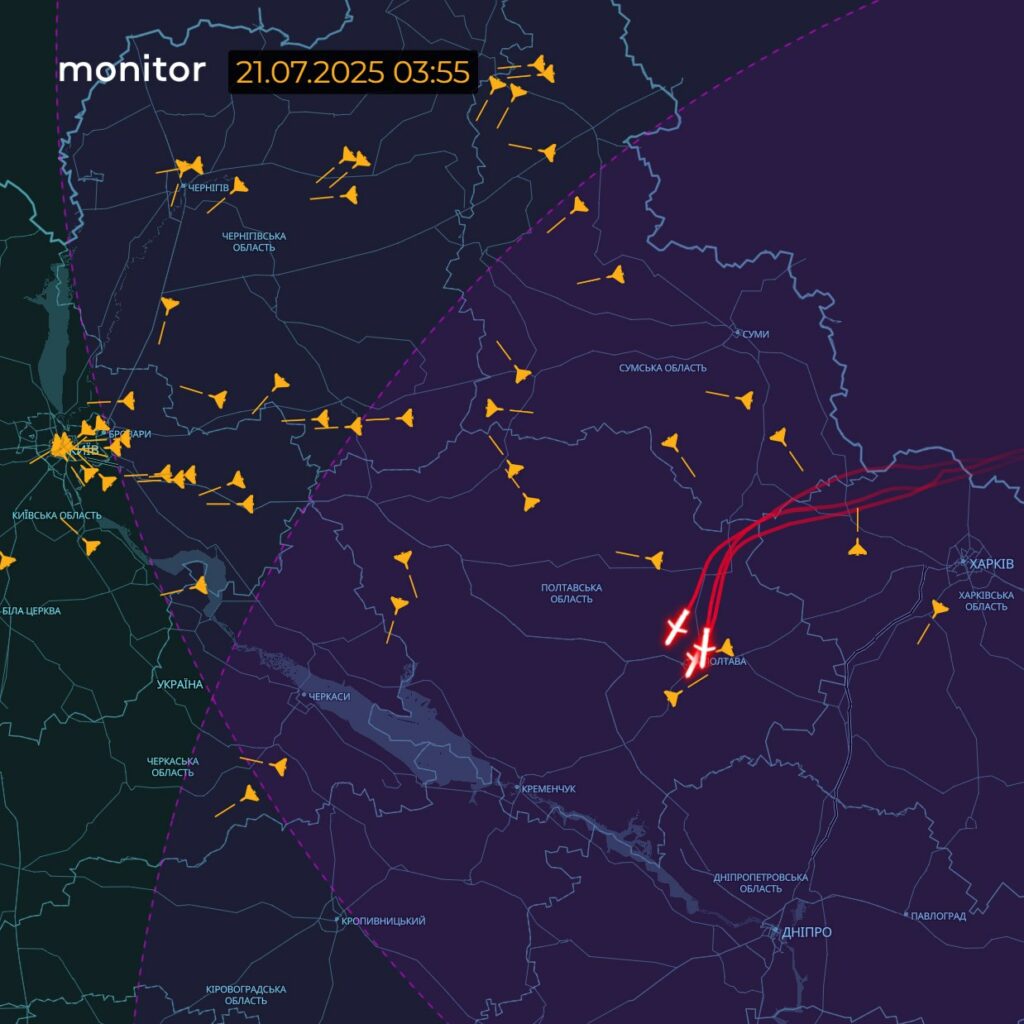 Канал Monitor повідомив про «3 групи КР у напрямку/повз Полтаву», а також про те, що «деякі ракети беруть курс на Полтаву». Водночас за даними «Розвідки України», «на околицях» були помічені «пара Шахедів».