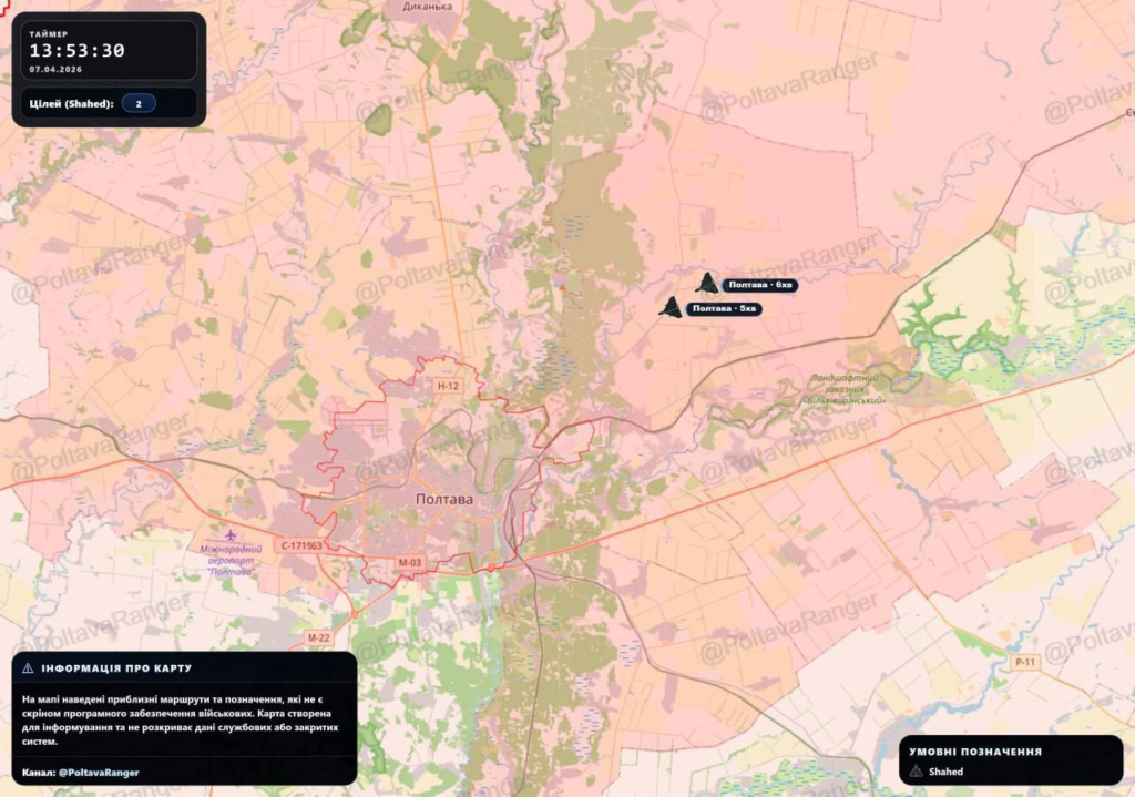 О 04:58 військові сповістили про «Шахед» в районі Пирятина. Уже о 05:36 у Котелевському районі виявили два БпЛА. О 05:44 дрон фіксували на межі Полтавської та Харківської областей. О 06:36 БпЛА продовжував маневрувати в небі над Котельвою, рухаючись на дуже низькій висоті. О 06:41 «Шахед» фіксували західніше Опішні.