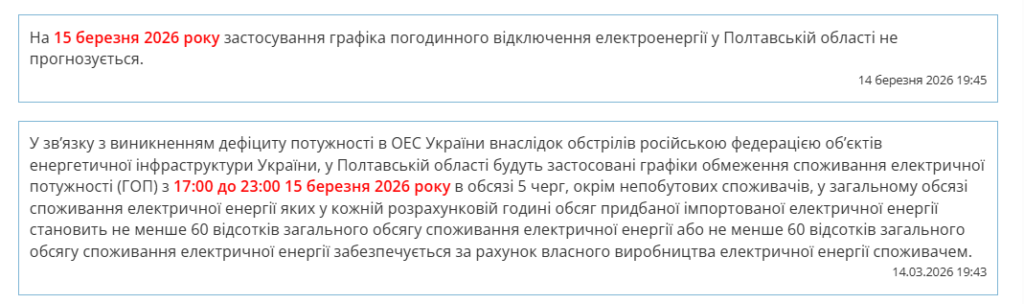У «Полтаваобленерго» повідомили, що 15 березня для мешканців області графіки погодинних відключень застосовувати не планують.