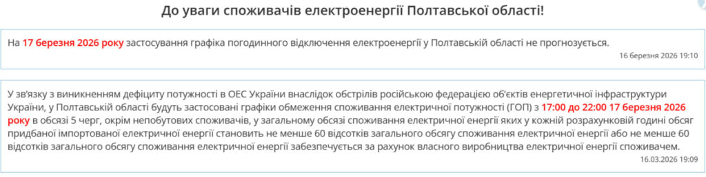 У «Полтаваобленерго» повідомили, що 17 березня для мешканців області графіки погодинних відключень застосовувати не планують.