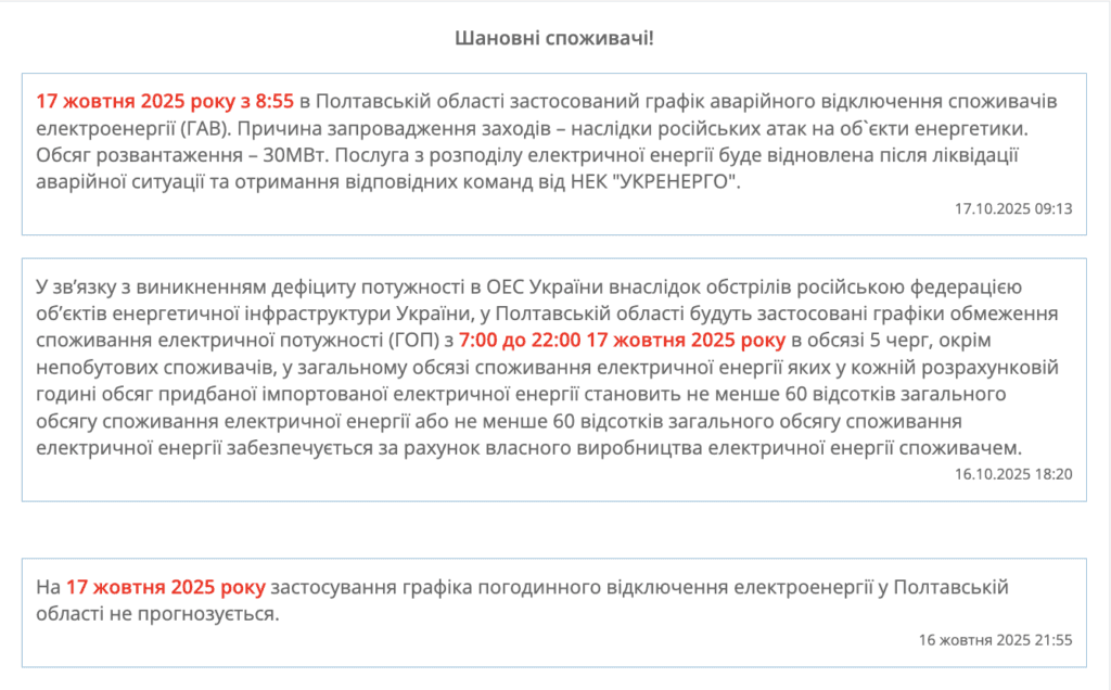 Графік погодинного відключення світла запроваджують тільки за потреби й після оголошення «Полтаваобленерго».
