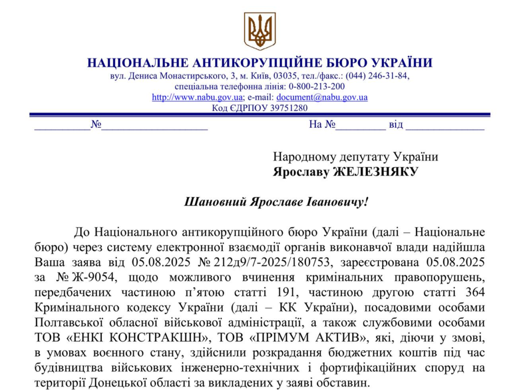ЗМІСТ писав, що справу можливого розкрадання грошей на будівництві фортифікацій на Донеччині розслідувало полтавське Бюро економічної безпеки з 2024 року. У серпні справу витребувало НАБУ.