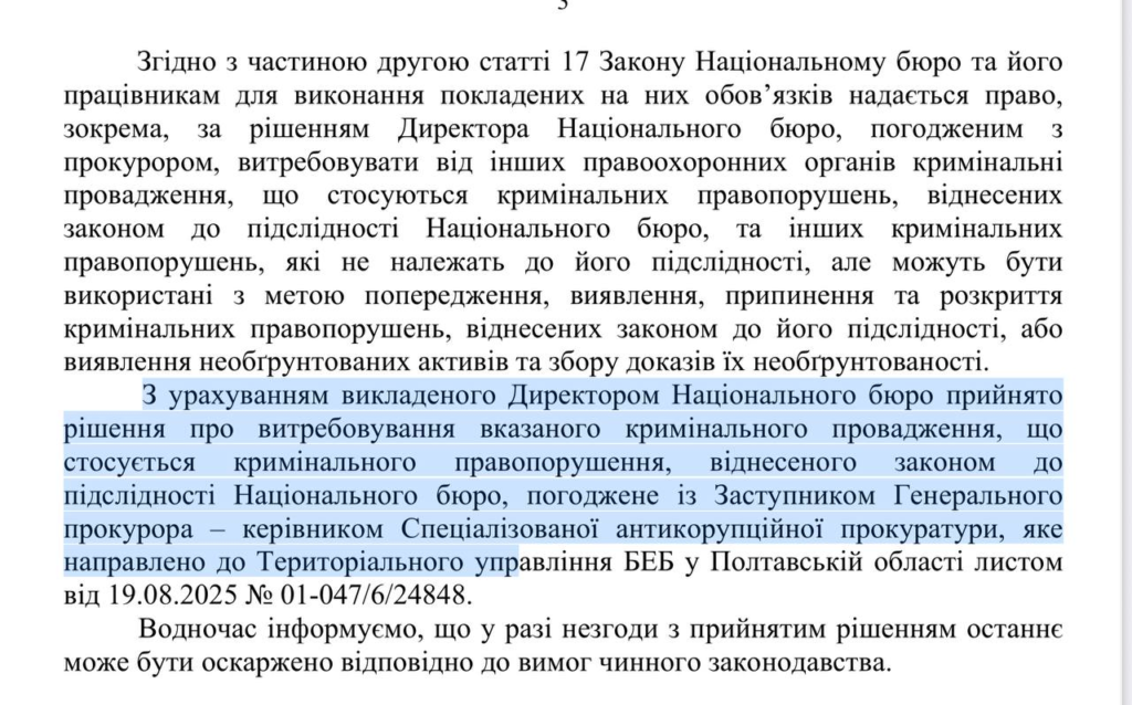 Національне антикорупційне бюро України звернулося до Територіального управління БЕБ у Полтавській області листом від 19 серпня щодо отримання матеріалів кримінального провадження.