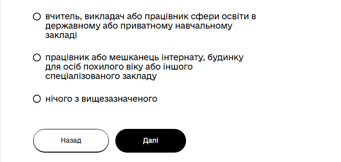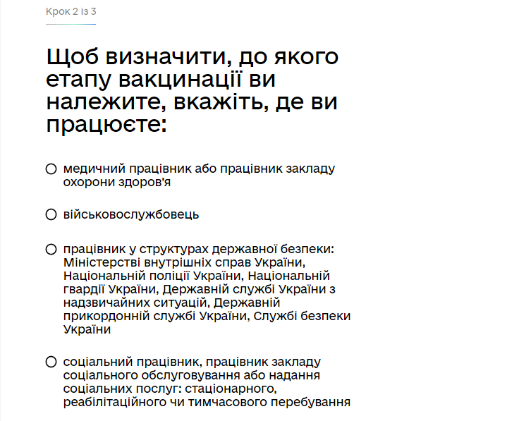 Крок 3. Вказати сферу професійної діяльності. Медикам, військовослужбовцям, працівникам структур державної безпеки, соціальним працівникам, вчителям записуватися не потрібно. Роботодавець або керівник установи внесе їх до списків за бажанням та повідомить про дату щеплення.