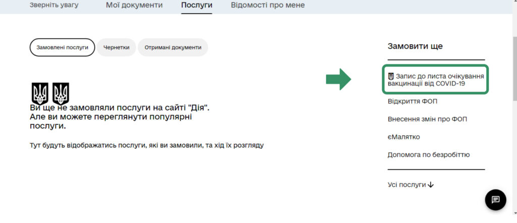 Крок 1. На головній сторінці порталу обрати розділ «Послуги» і в ньому натиснути на «Запис до листа очікування вакцинації від COVID-19»