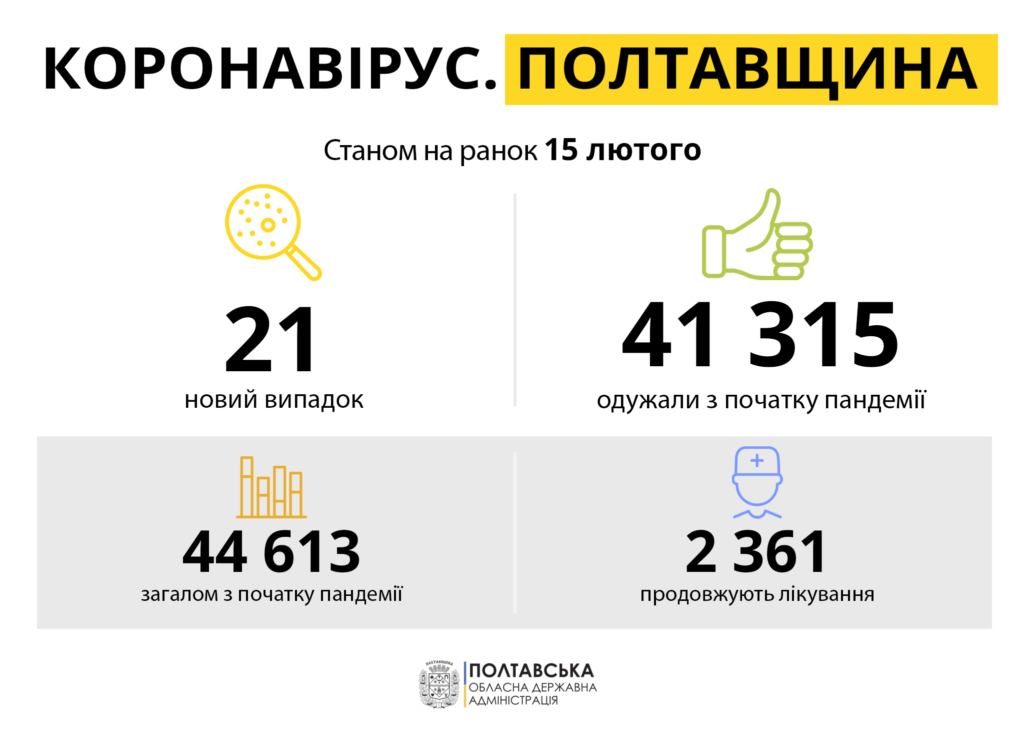 14 лютого в області виявили коронавірусну хворобу у 21 людини. Минулої доби на Полтавщині не одужала від коронавірусу жодна людина. Також не зафіксували жодної смерті.