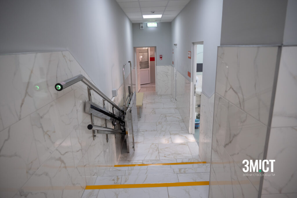 Зокрема, встановили пандус українського виробництва, який дає змогу людині з порушеннями опорно-рухового апарату безпечно подолати кілька сходинок. Також у будівлі працює ліфт українського виробництва. Ним можуть скористатися пацієнти, які прибувають автомобілем і потребують доступу на другий поверх медико-санітарної частини.