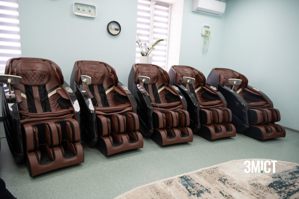 У кімнаті є великий екран для демонстрації навчальних матеріалів або спеціально підібраних відео й музичних композицій, які сприяють зниженню стресу. Також використовують аромалампи та спеціальні реабілітаційні крісла. Один сеанс триває близько 20 хв і не є масажем – це окремий формат психоемоційної реабілітації, спрямований на глибоке розслаблення та переключення уваги.