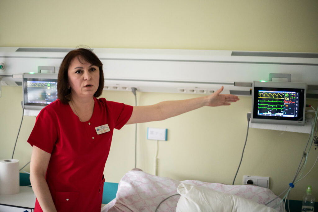 Усі ліжка в палатах обладнані кардіомоніторами, які відстежують функції організму, а також до них централізовано підведений кисень. У палатах є відеоспостереження, за допомогою якого медики стежать за станом пацієнтів. Дані з усіх камер надходять на пост чергової медсестри, а показники хворих – до станції лікаря.