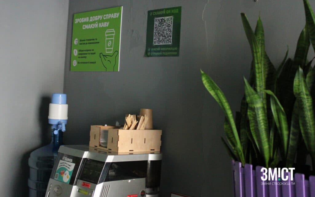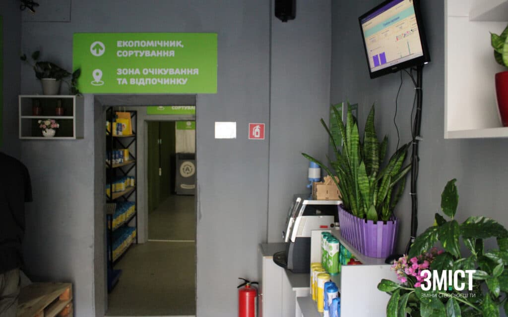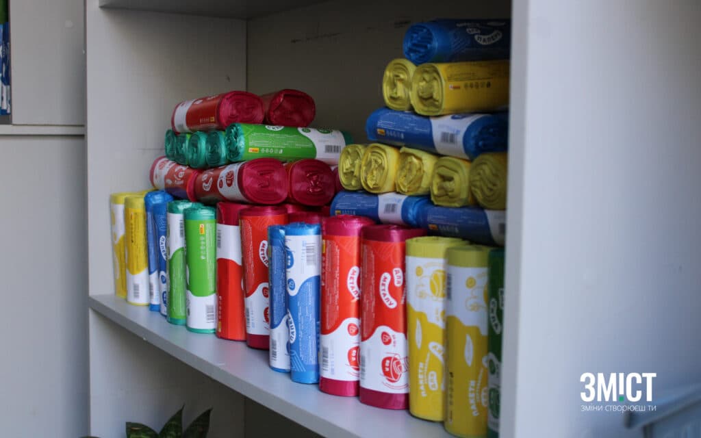 Зайшовши у приміщення, потрапите у зал для відвідувачів, де вас зустріне адміністратор пункту – екопомічник. Тут можна взяти каву та пакети для подальшого сортування вдома: зелені, червоні, сині та жовті для різних типів відходів.