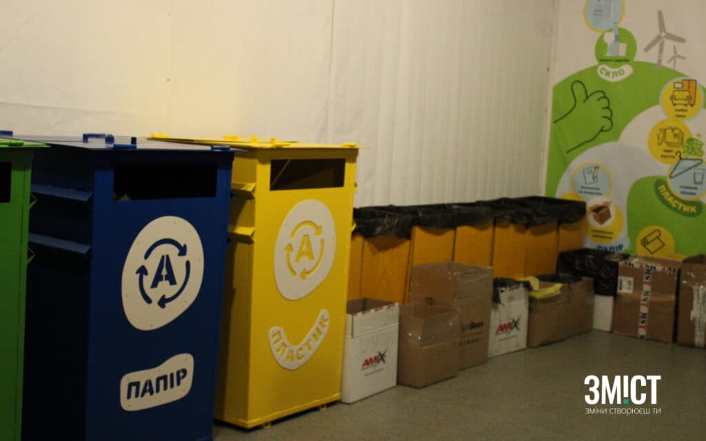 В іншій кімнаті, яка призначена для сортування, знаходяться різноколірні баки, куди можна принести: