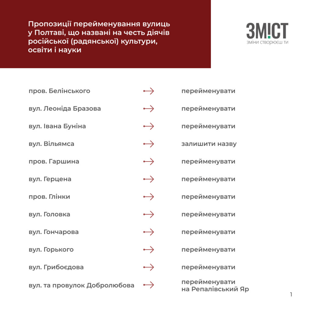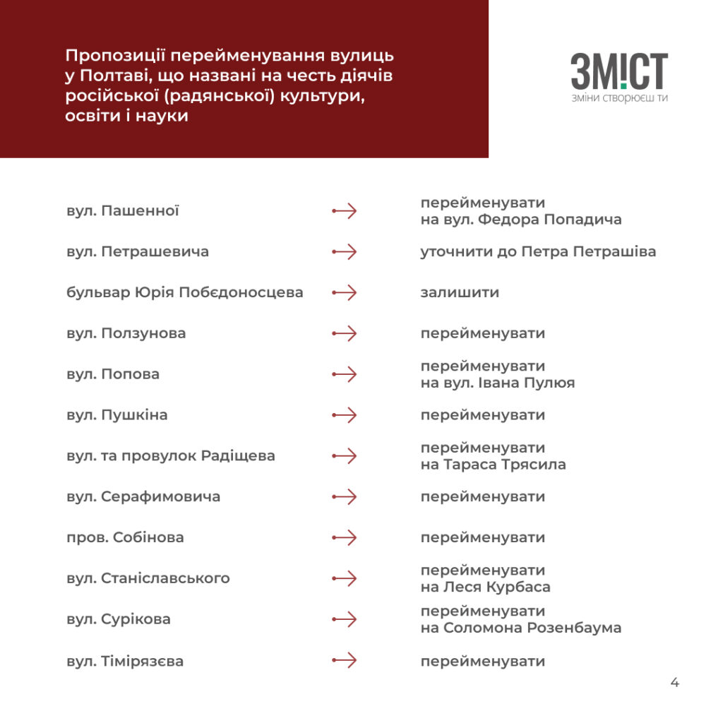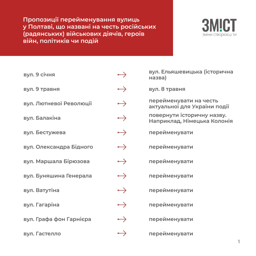 Полтавські краєзнавці та історики розробили перелік вулиць й аналітичну довідку про те, які вулиці та чому потрібно перейменувати, або залишити. Усього проаналізували 507 назв.