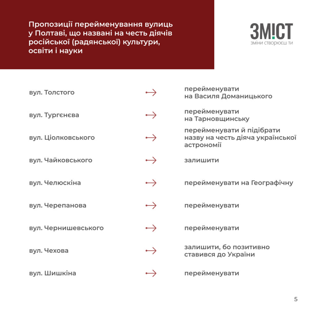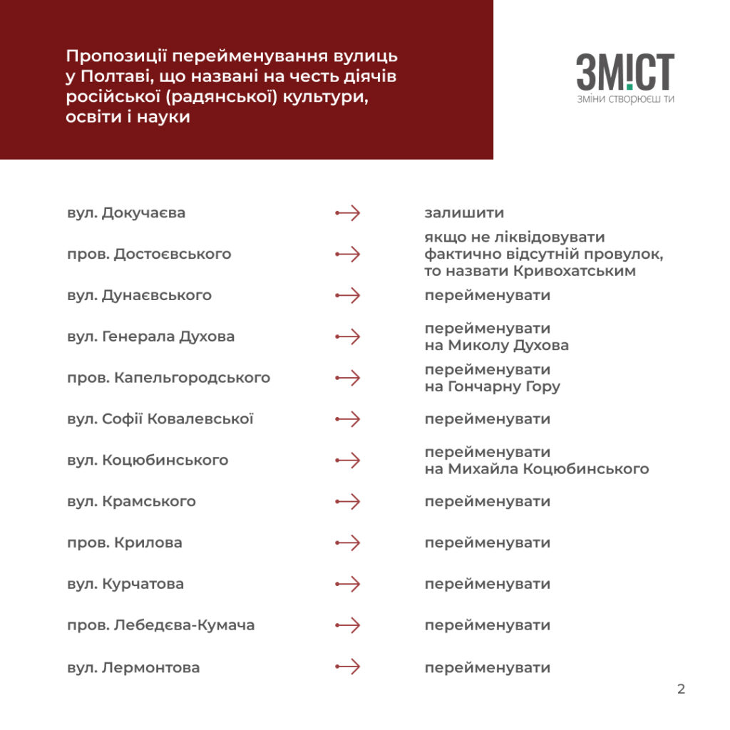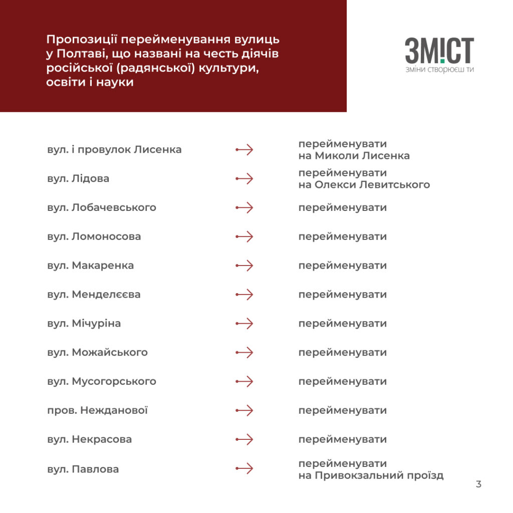 Полтавські краєзнавці та історики розробили перелік вулиць й аналітичну довідку про те, які вулиці та чому потрібно перейменувати, або залишити. Усього проаналізували 507 назв.