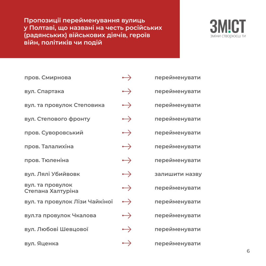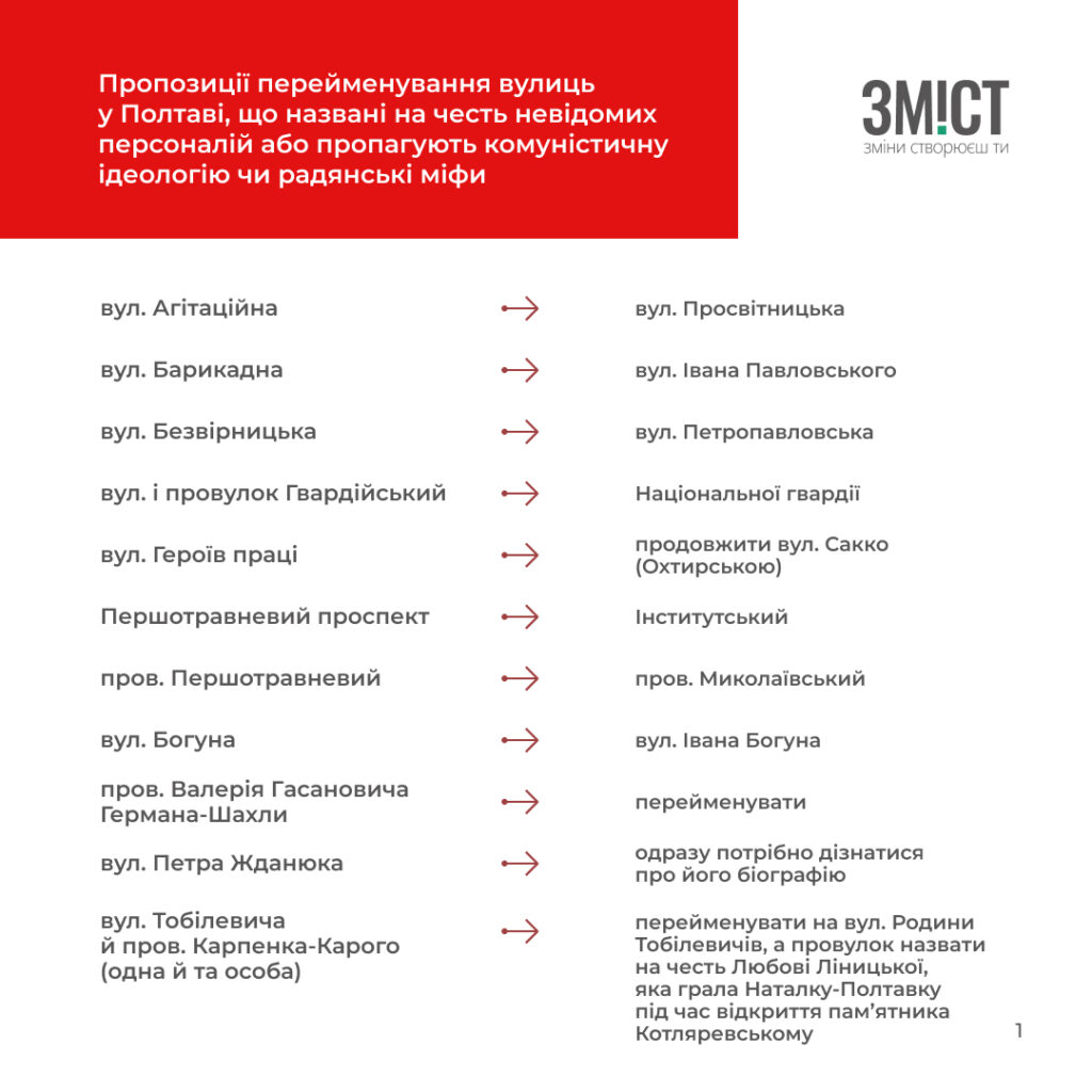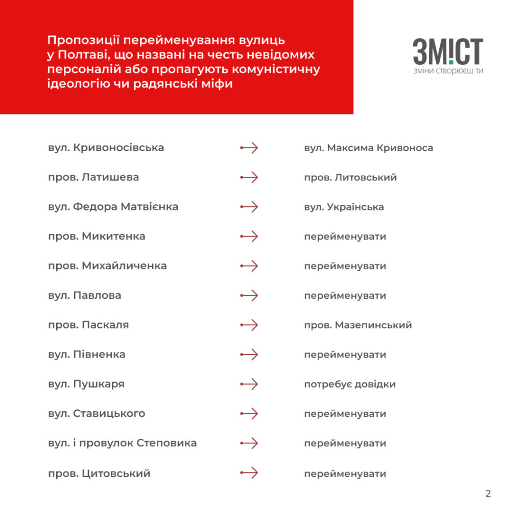 - потребують перейменування як названі на честь невідомих персоналій або пропагують комуністичну ідеологію чи радянські міфи у Полтаві – 26;