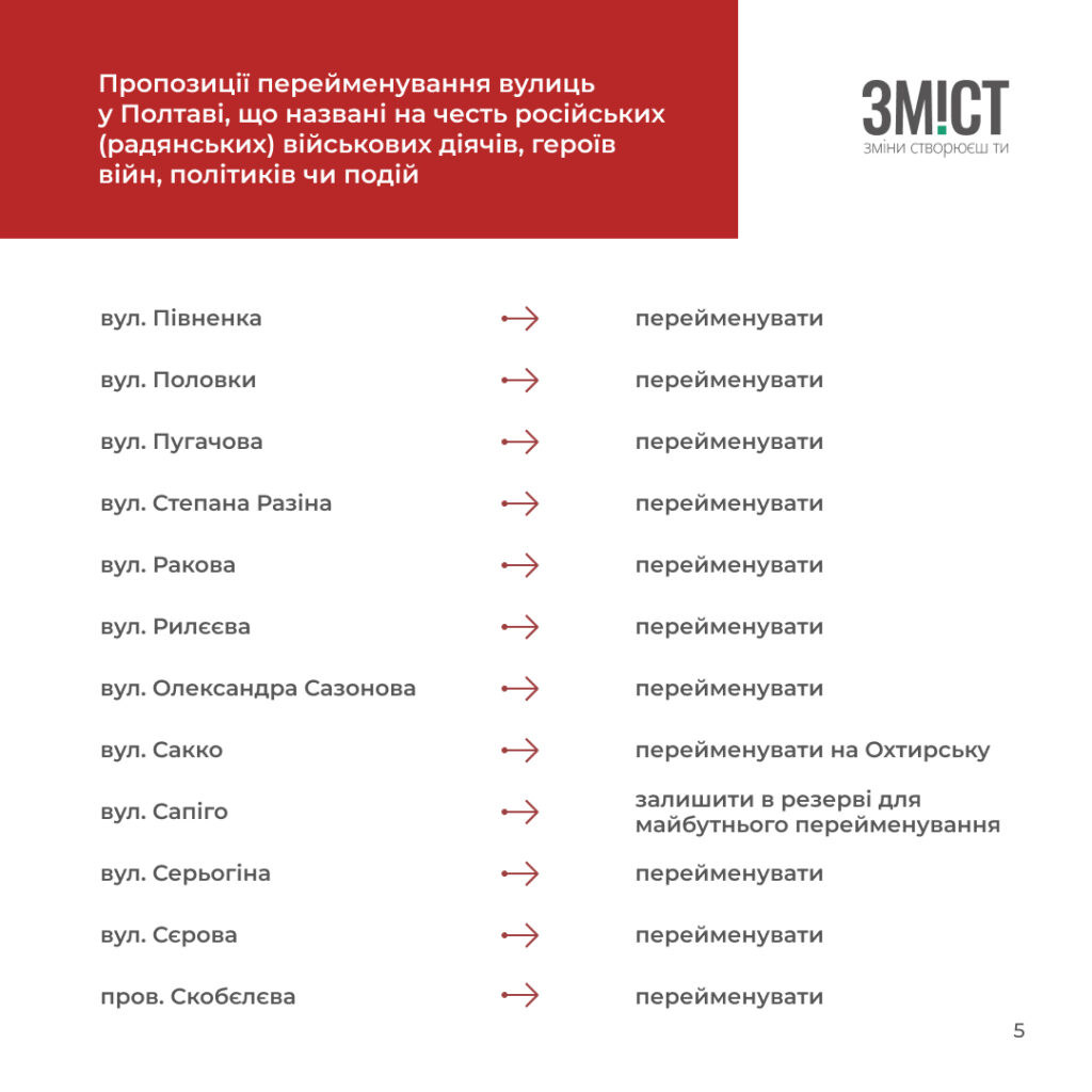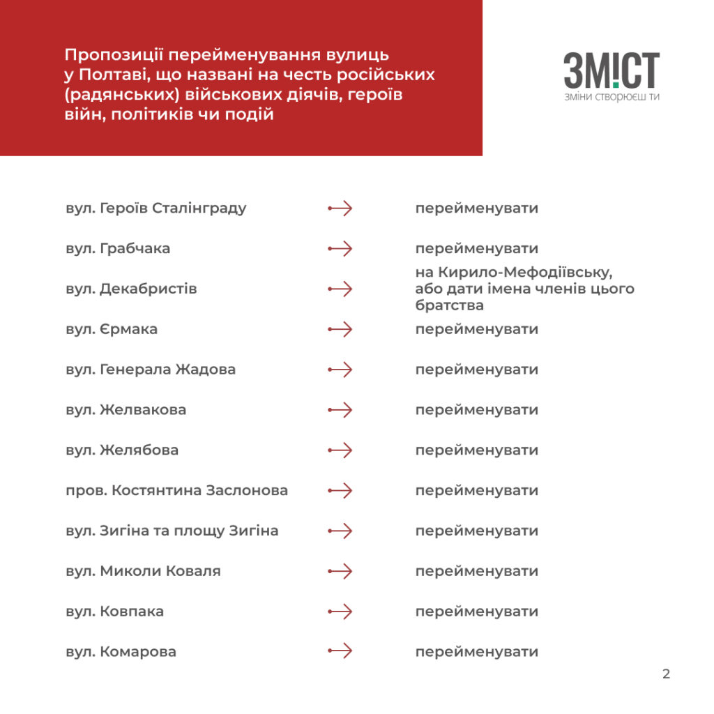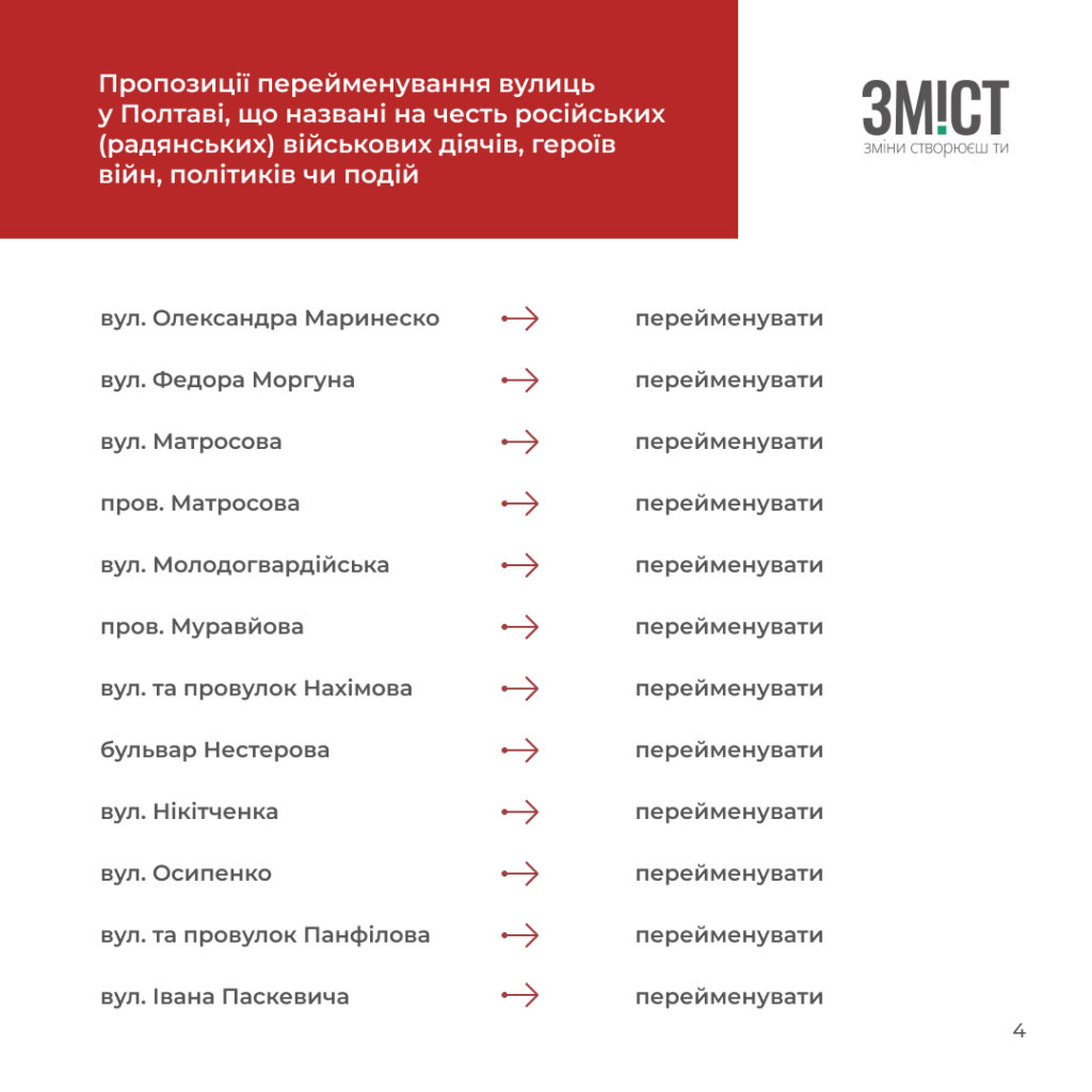 - потребують перейменування як названі на честь невідомих персоналій або пропагують комуністичну ідеологію чи радянські міфи у Полтаві – 26;