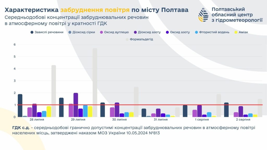 - формальдегід – щоденне перевищення від 4 до 8 ГДК (найвищий показник – 9 липня).