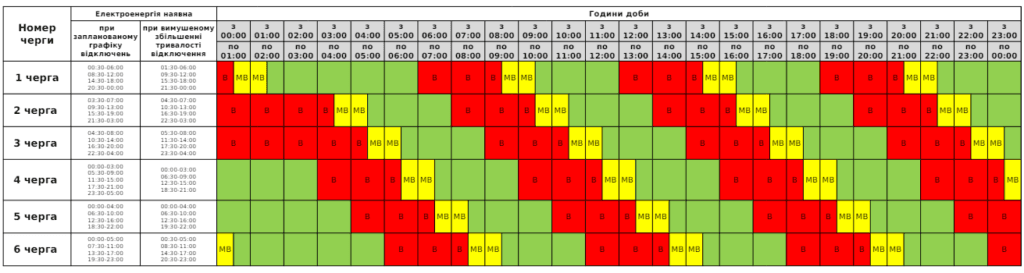 - жовто-зелений – у перші пів години світло є, але за потреби її можуть вимкнути, а в другі 0,5 години світло точно є.