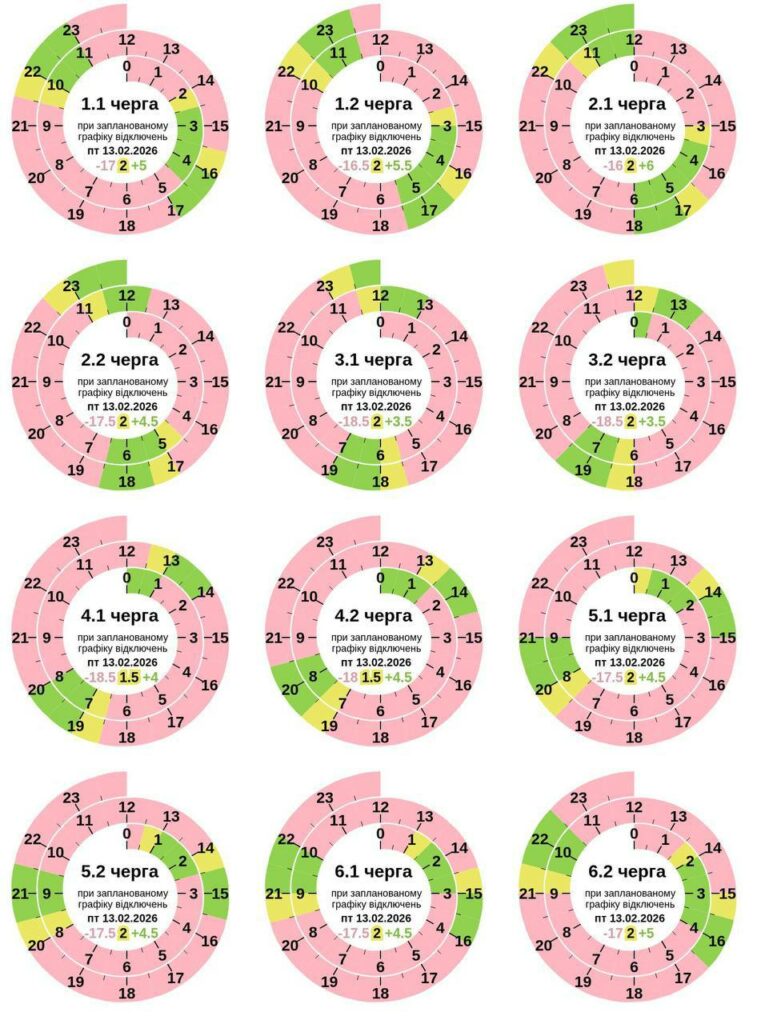 Знеструмлення охоплюють шість черг споживачів. Вони триватимуть від 4 год до 4,5 год для кожної з черг у різний час доби: