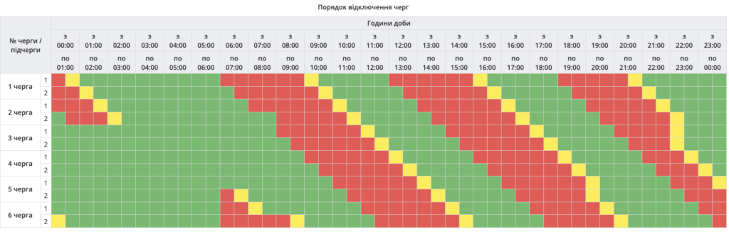 Знеструмлення охоплюють шість черг споживачів. Вони триватимуть від 1,5 год до 3 год для кожної з черг у різний час доби: