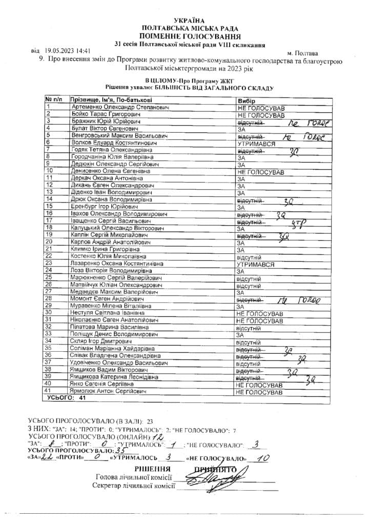 Домовленості закріпили травневим голосуванням на сесії Полтавської міської ради за Програму розвитку житлово-комунального господарства. Тоді Катерина та Вадим Ямщикові були єдині з їхньої фракції, хто проголосував «за» деякі принципові питання. Зокрема програму ЖКГ, довівши справжню лояльність. Друге принципове питання – бюджет, яке підтримали й інші учасники майбутньої коаліції у вигляді фракції «Рідне місто» у повному складі.