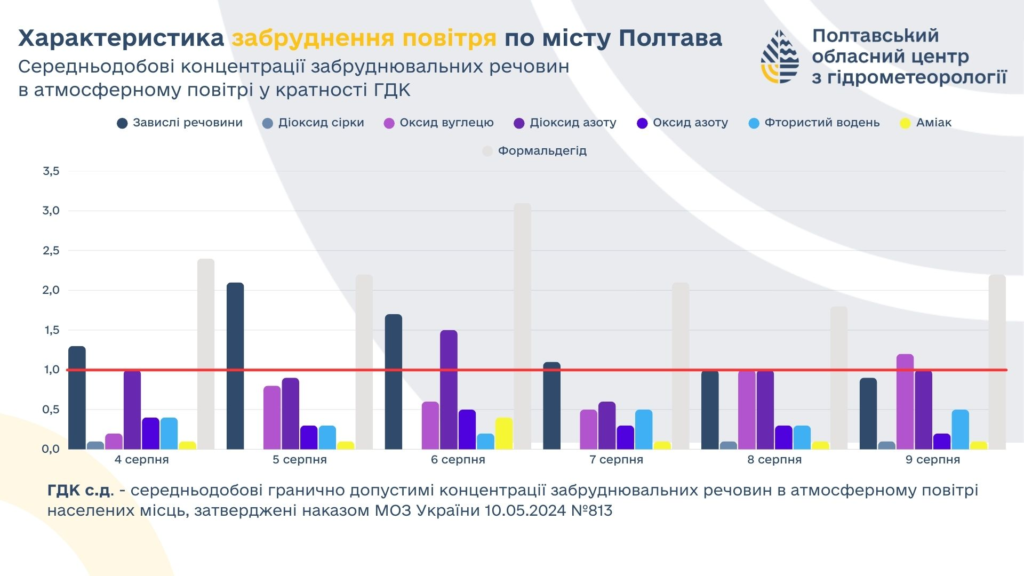 Про це відомо з даних Полтавського обласного центру з гідрометеорології від 13 серпня. Тижневий моніторинг якості повітря показав, що впродовж 4-9 серпня в Полтаві перевищення середньодобової концентрації зафіксували за наступними забруднювачами: