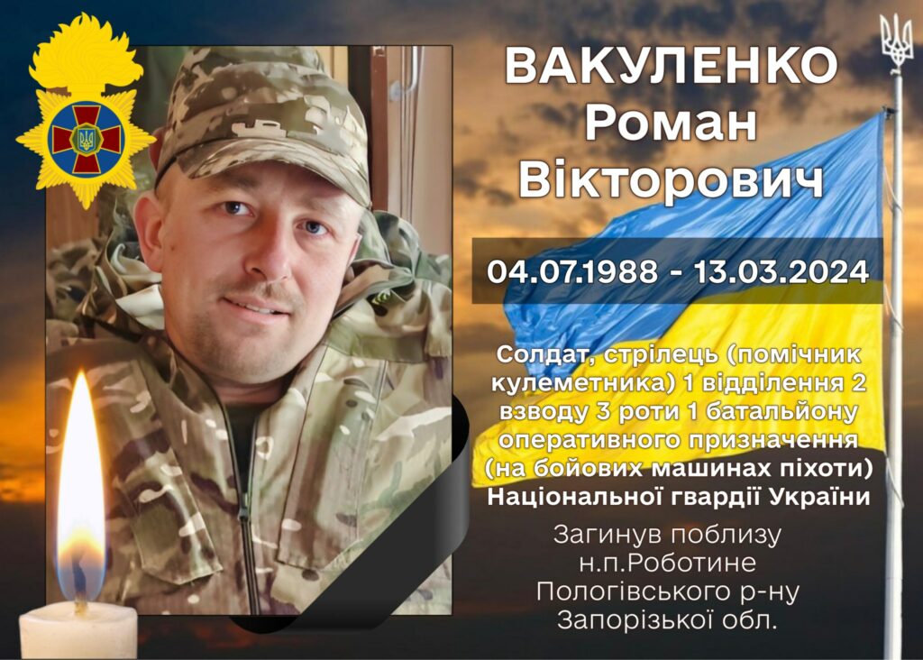Солдат Роман Вакуленко народився 4 липня 1988 року. Служив помічником кулеметника на бойових машинах піхоти. Захисник прийняв свій останній бій 13 березня 2024 року поблизу населеного пункту Роботине Запорізької області. Він отримав тяжку травму та опікову хворобу внаслідок ворожого удару FPV-дроном.
