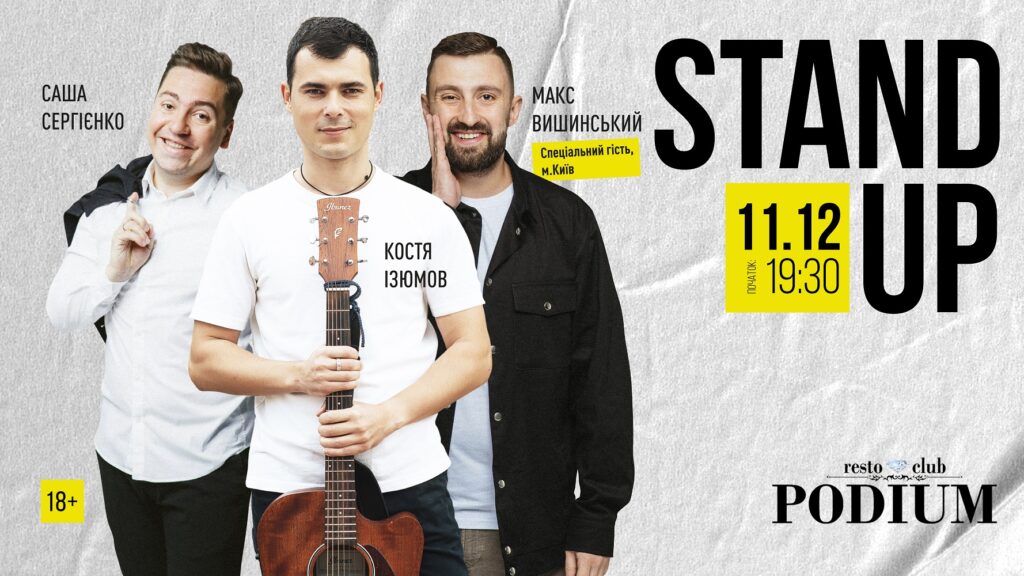 На глядачів чекає стендап з гітарою від Констянтина Ізюмова, виступ коміка Олександра Сергієнка та стендап від Максима Вишинського.