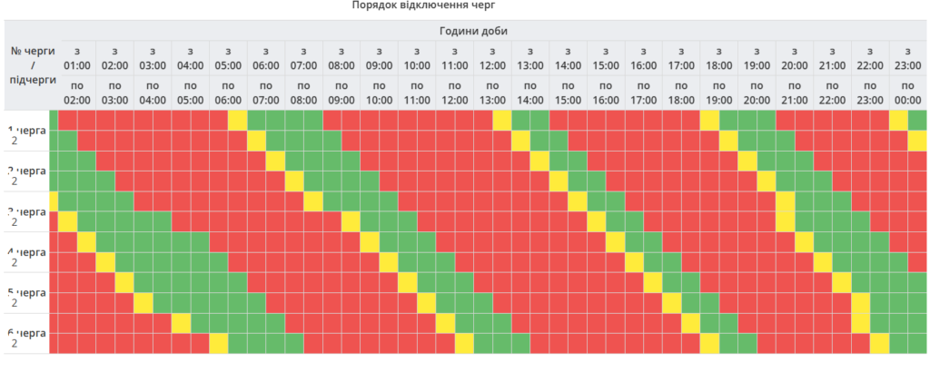 Знеструмлення охоплюють шість черг споживачів. Вони триватимуть від 3 до 4,5 годин для кожної з черг у різний час доби: