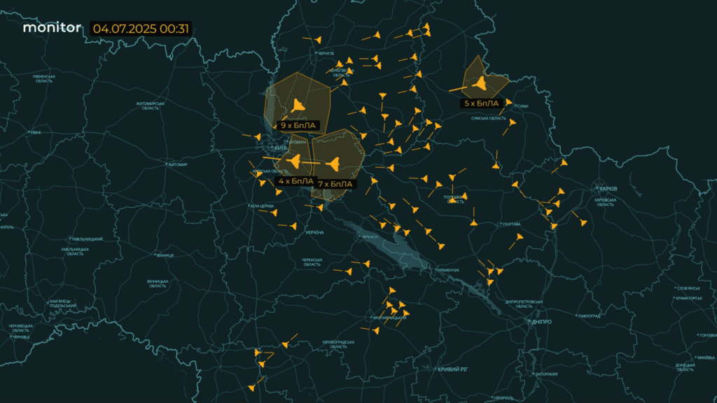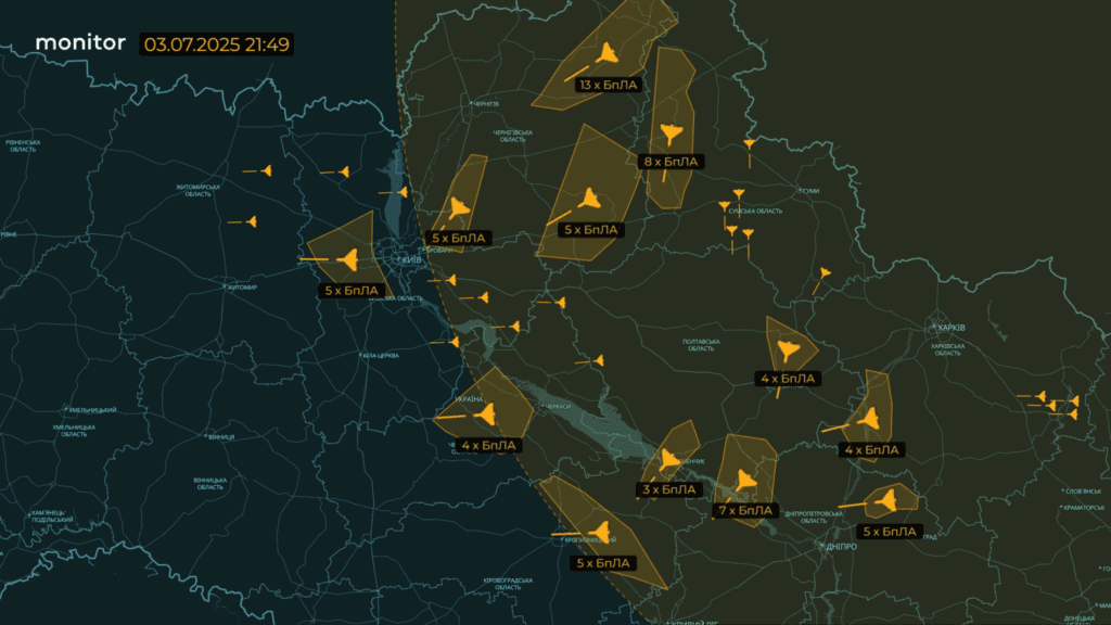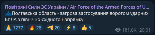Про дрони на Полтаву та область повідомляли Повітряні Сили та OSINT-спільноти у ніч на 4 липня.