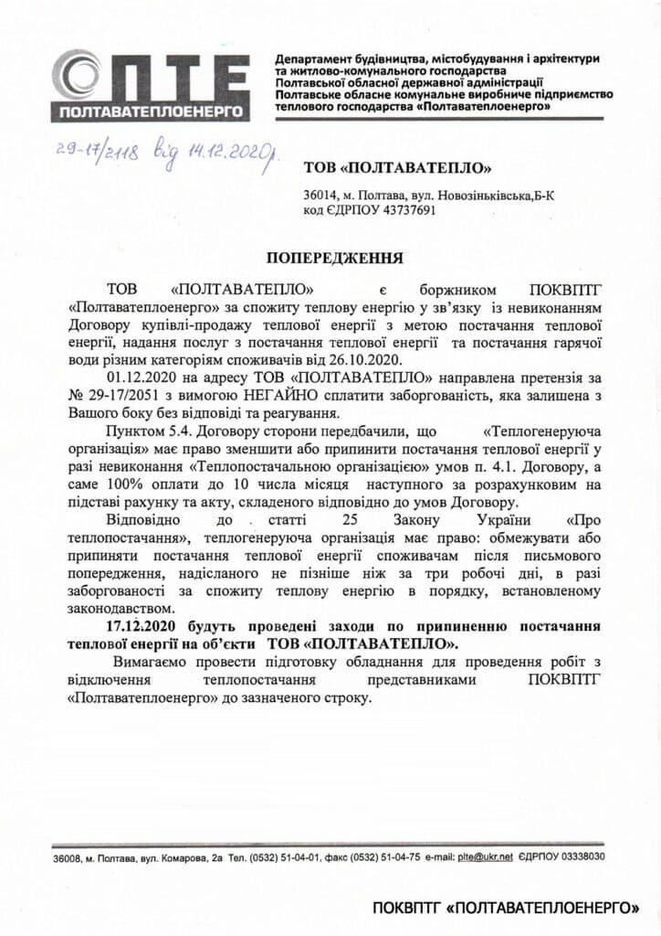 14 грудня обласне комунальне підприємство «Полтаватеплоенерго» надіслало листа до міського комунального підприємства «Полтаватепло», яке розподіляє теплову енергію у 109-мікрорайоні. У листі зазначено, якщо міське підприємство не сплатить до «Полтаватеплоенерго» борг 2,5 млн грн, то з 17 грудня обласне підприємство припинить теплопостачання. Про це повідомив речник «Полтаватеплоенерго» Олександр Циганок.