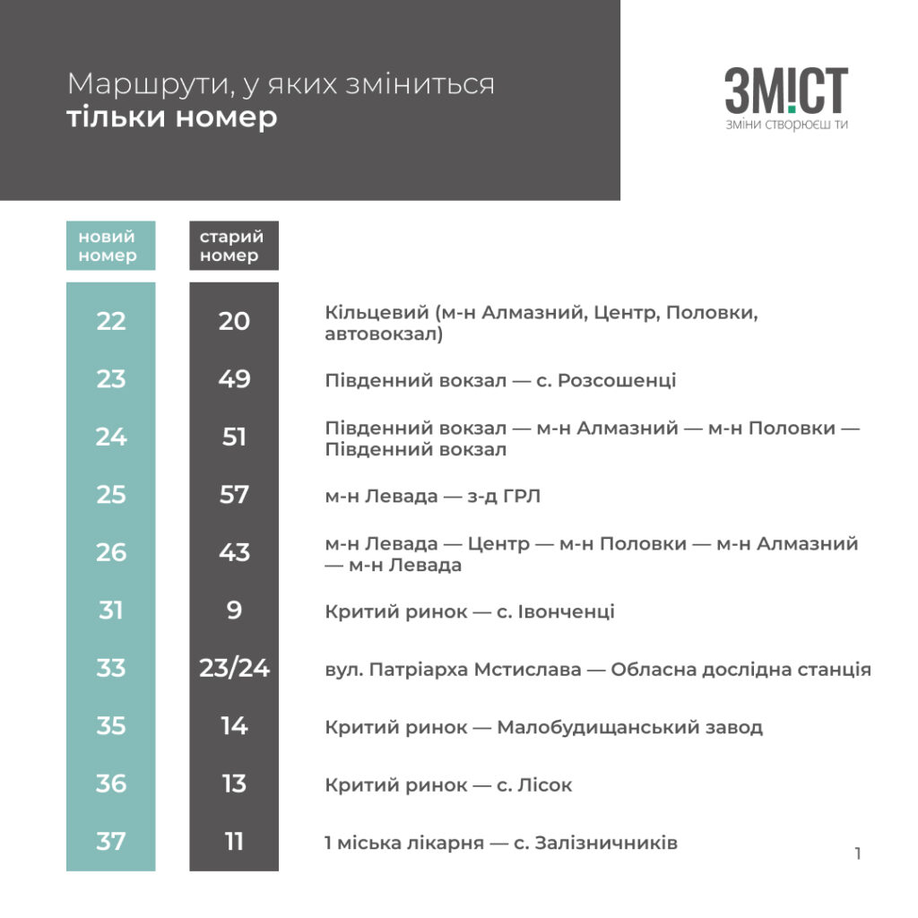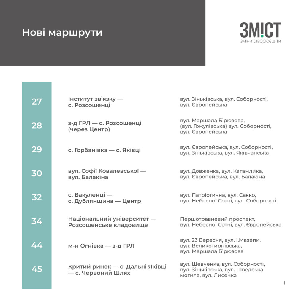 Змін не зазнали маршрути тролейбусів та 21 кільцевий. Про нововведення на інших дивіться в графіці ЗМІСТу.